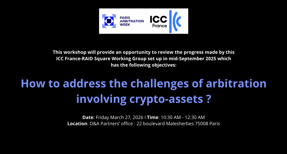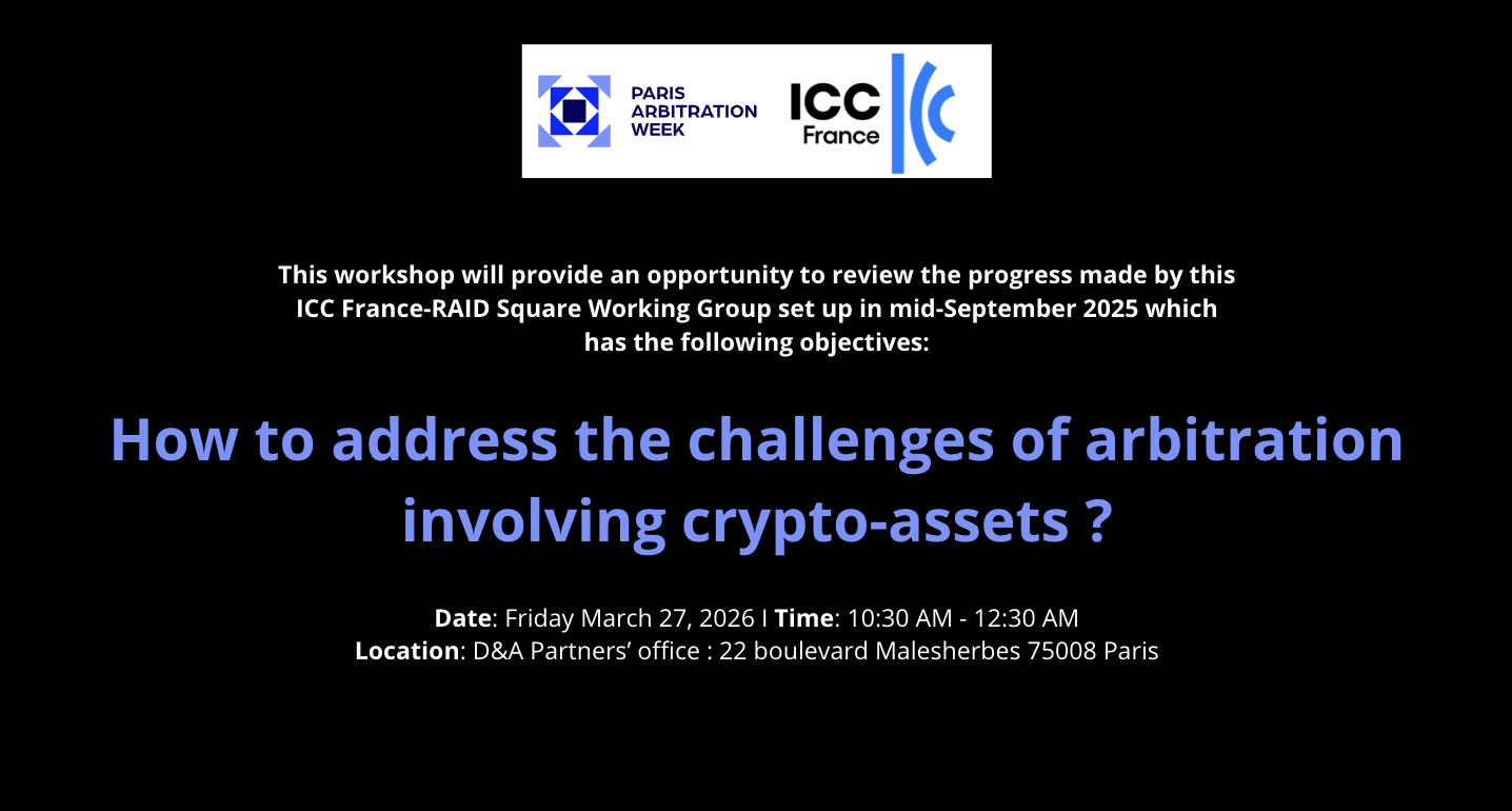 These issues and many more were discussed during the ICC France – RAID Square working group event on the topic “How to address the challenges of arbitration involving crypto-assets?” hosted by d&a partners.